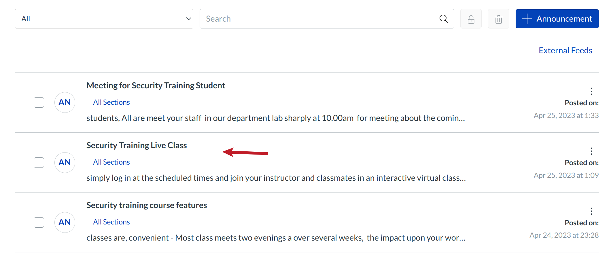 Click the announcement title to open the announcement.