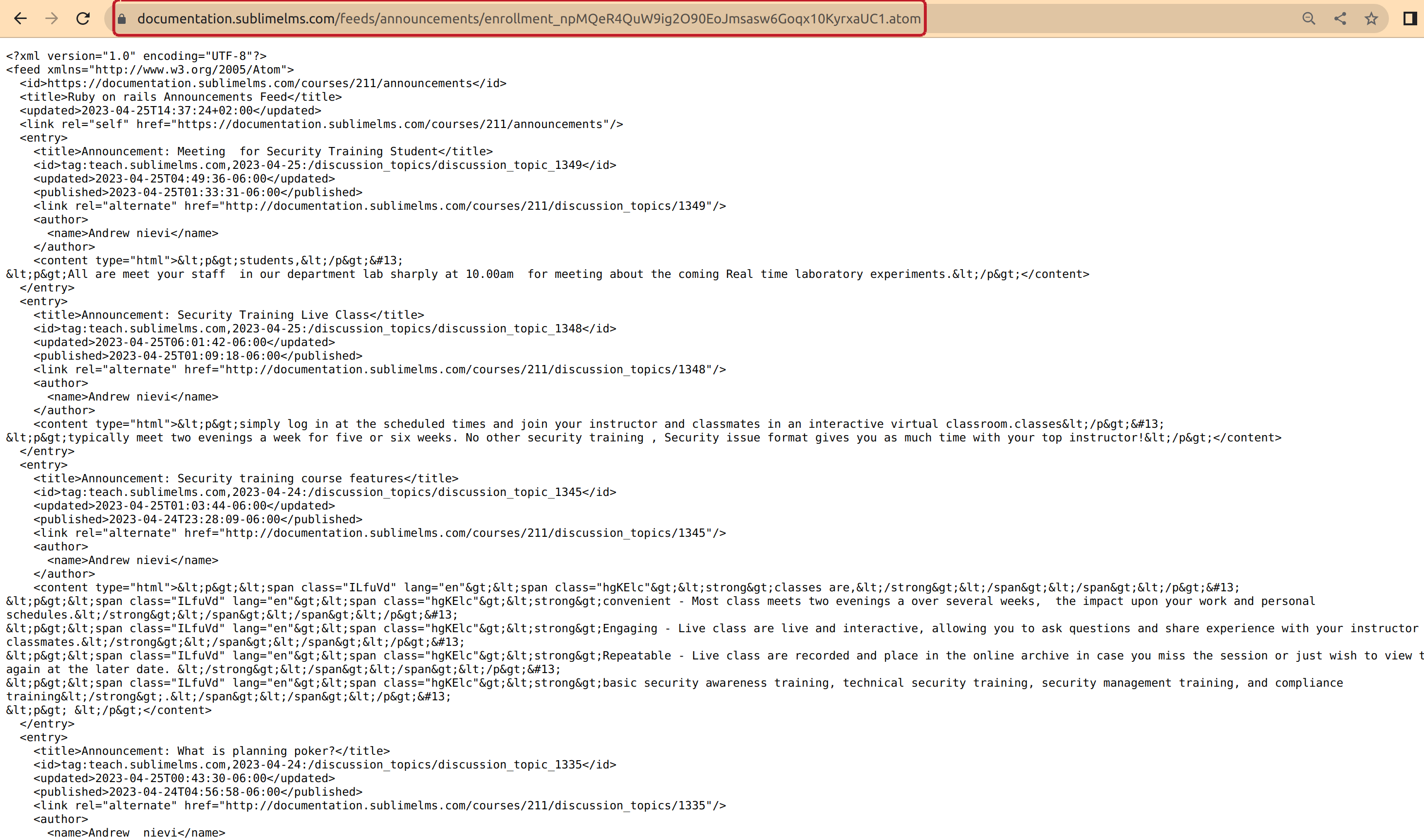 When set up as part of Announcements, the Announcement RSS Feed displays all posts from Announcements. These posts can be from an announcement or from external RSS feeds on the Announcement Index Page.