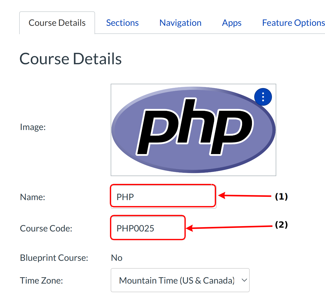 Edit Course Name and Course Code by typing in the course name[1] and course code[2] fields.