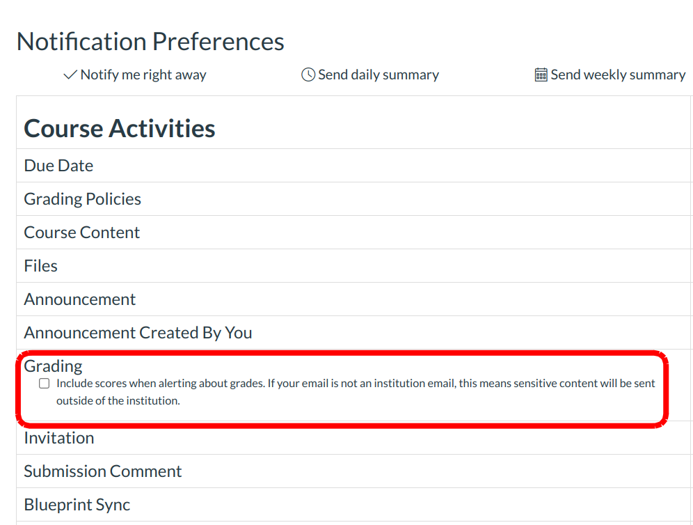You can also specify whether you want to receive notifications about updates to the grading policy (assignment group weighting) on your submitted assignments.